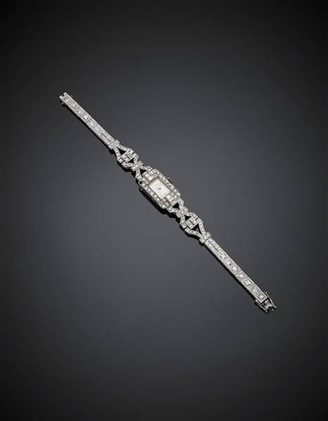Orologio da polso da donna in platino con diamanti rotondi e a baguette, per complessivi ct. 4,20 circa, g 26,88, lungh. cm 16,80 circa. (lievi difetti e mancanze)