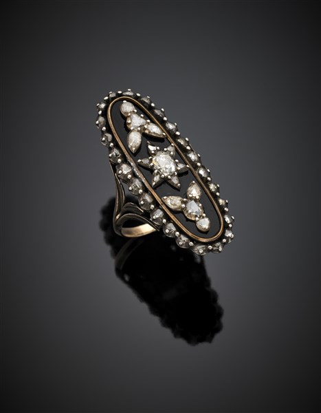 Anello ovale in oro rosso 333/1000 e argento rifinito in onice diamanti per complessivi ct. 1,00 circa, g 11,65 misura 22,5/62,5.