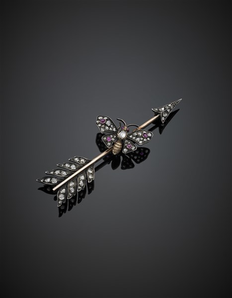 Spilla a freccia con farfalla in oro giallo, argento, diamanti a mezza rosetta e rubini a cuscino, g 17,33, lungh. cm 8,50 circa.