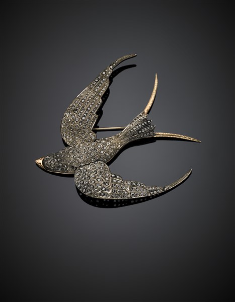 Rose cut diamond, silver and 14K gold swallow brooch, g 30.11, length cm 9.20, width cm 8.40 circa. With original case