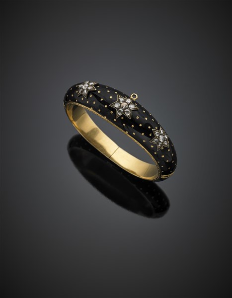 Bracciale in oro giallo e smalto nero rifinito con tre stelle in diamanti a mezza rosetta, chiusura a scatti regolabili, g 39,05, diam. cm 5,80. Marchio francesi. (lievi difetti e mancanze)