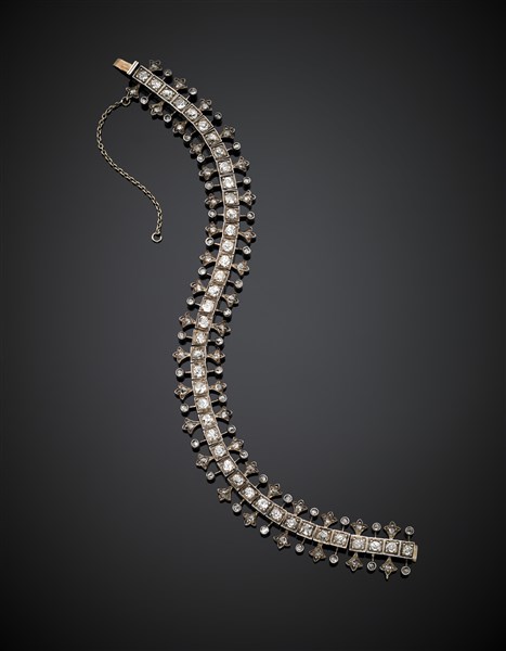 Bracciale flessibile in oro e argento rifinito con diamanti per complessivi ct. 4 circa g 34, lungh. cm 18,80 circa. Marchi francesi di importazione.
