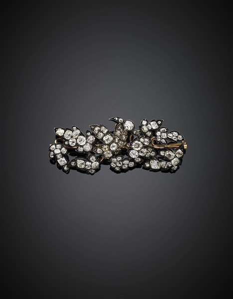 Spilla a guisa di tralcio d'edera in oro rosso 333/1000 e argento rifinita con diamanti old mine per complessivi ct. 6,50 circa, g 10,80, lungh. cm 5,80 circa.