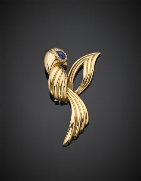 Spilla in oro giallo a guisa di uccellino, l'occhio in lapislazzuli e diamanti, g 30,82, lungh. cm 6,50 circa. Firmato con punzone Boucheron, per esteso Boucheron, OR 750, P20664. In scatola originale Boucheron