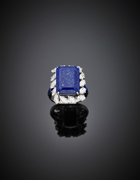 Anello in platino con lapislazzuli centrale di mm 16x12x7.25 circa e diamanti a navette per complessivi ct. 2 circa, lapislazzuli cabochon a rifinire il gambo, g 10,89 misura 13/53. Firmato Mauboussin Paris, 18673, marchi francesi, G in quadrato e rombo.
