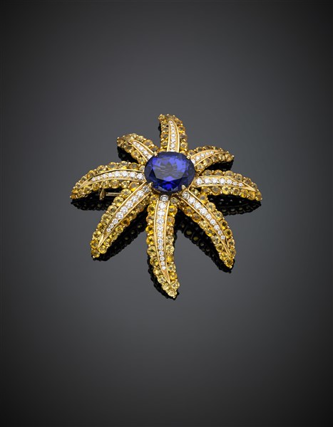 Diamond in all ct. 0.75 circa, yellow sapphire and ct. 10.25 circa central tanzanite "Fireworks" yellow gold brooch, g 23.06, length cm 5.60 circa. Signed and marked Tiffany & Co, (C)1993,Fireworks, ES.