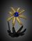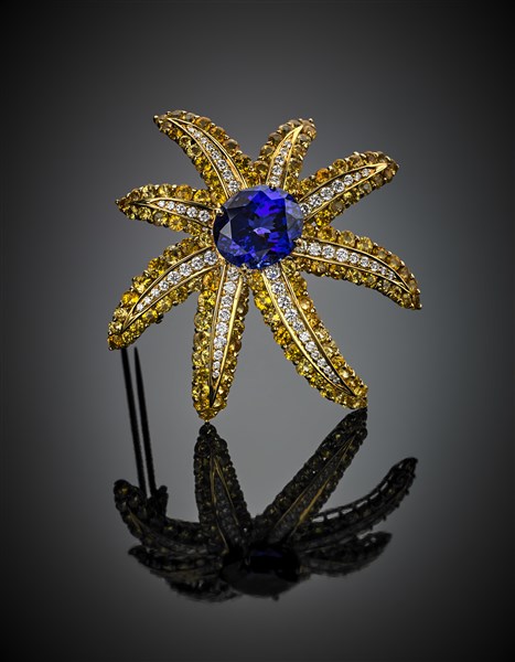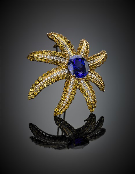 Broche "Fireworks" in oro giallo con diamanti per complessivi ct. 0,75 circa, corindoni gialli e tanzanite centrale di ct. 10,25 circa, g 23,06, lungh. cm 5,60 circa. Firmata e marcata Tiffany & Co, (C)1993,Fireworks, ES.