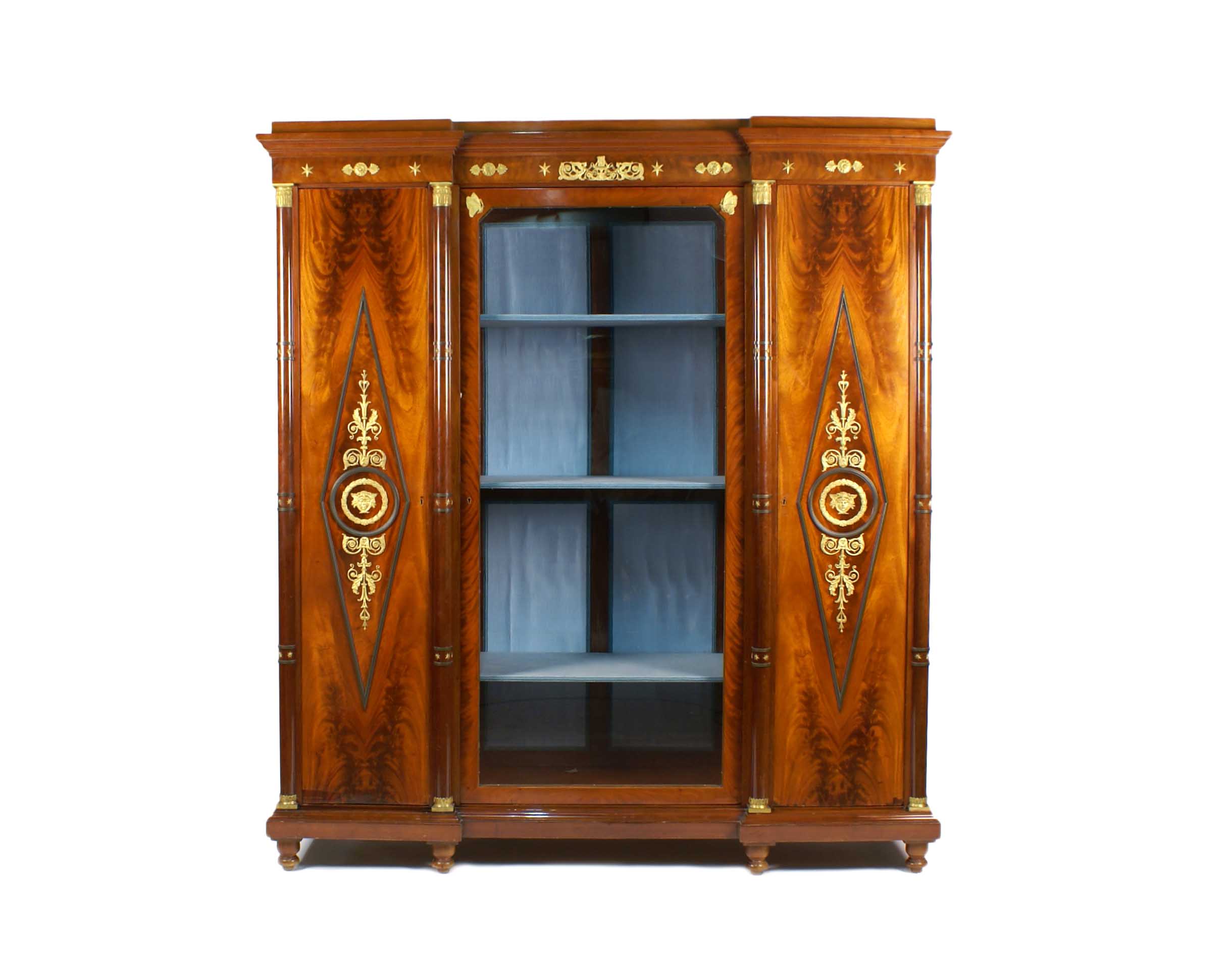 LIBRERIA IMPERO IN MOGANO E PIUMA DI MOGANO Francia, XIX Sec. Fronte a tre ante delimitate da colonne con capitelli, con ricche applicazioni in bronzo dorato e finemente cesellato, interni e ripiani parzialmente rivestiti in tessuto Dim. 215x194x60 cm.