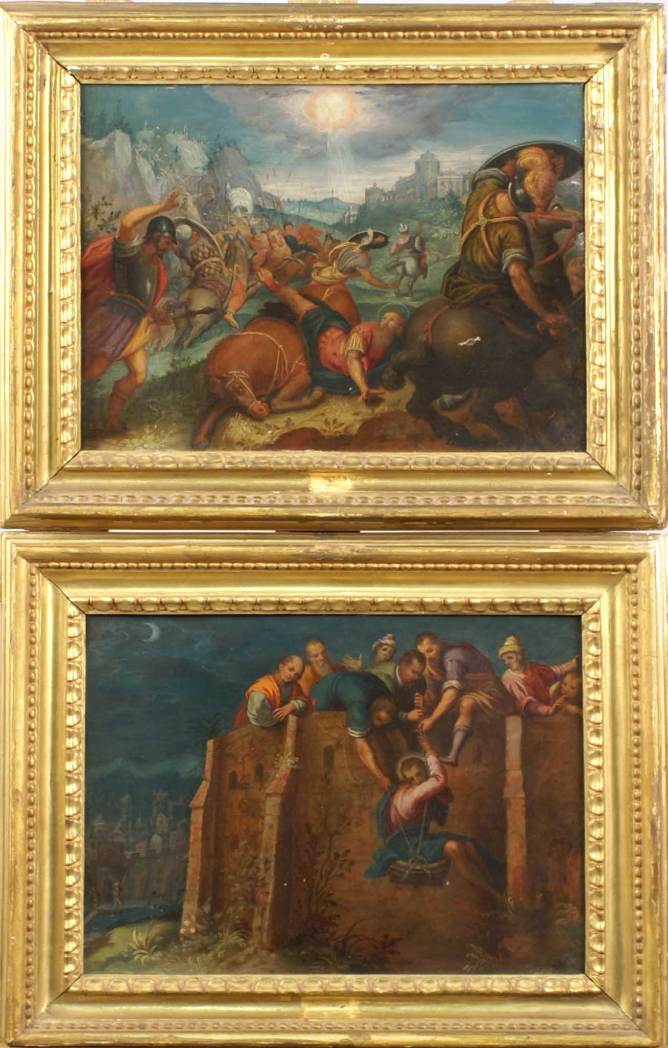 LEANDRO BASSANO, ATTRIBUITO, COPPIA DI OLI Bassano del Grappa 1557 - Venezia 1622 "Scene tratte dalla vita di San Paolo", coppia di oli su rame, entro cornice Dim. 25 cm.