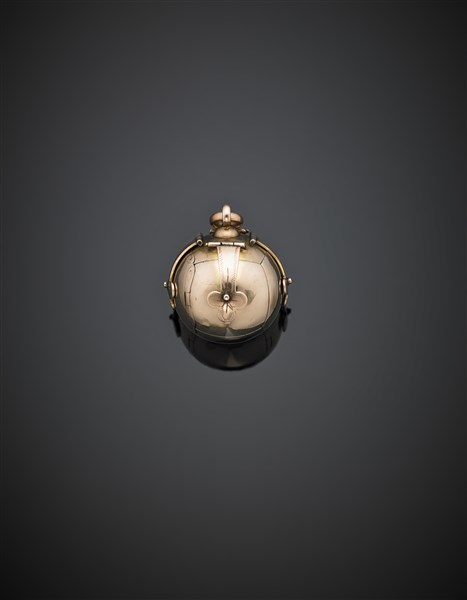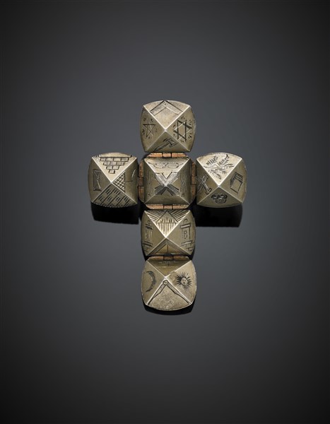 Pendente a boule in oro giallo 333/1000 e argento, apribile a formare una croce con simboli massonici, diametro da chiuso mm 20,80 circa, g 12,76, lungh. cm 5,60 circa. Marcato D & Co.
