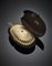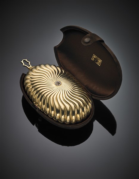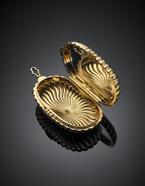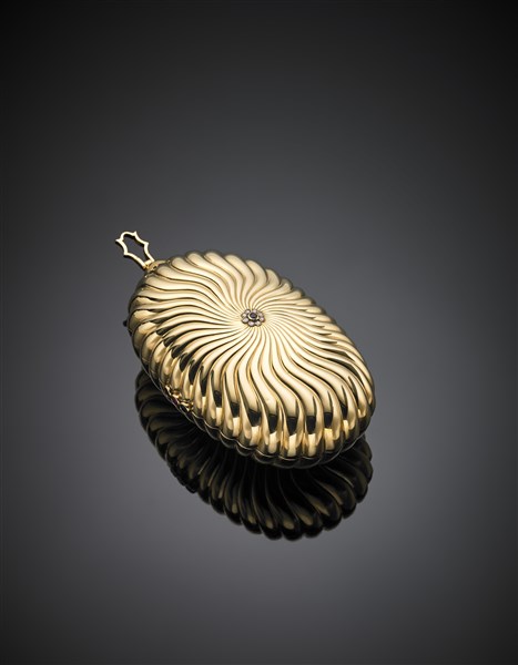 Pochette in oro giallo scanalato rifinita con diamanti, zaffiri e rubini, uno specchio all'interno, lordi g 391,67, lungh. cm 16, largh. cm 8,50, h cm 5 circa. Marcata 630 AL. In custodia Bulgari