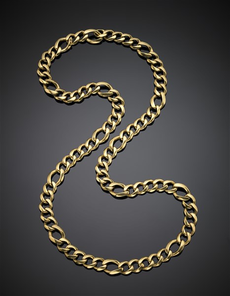 Collier in oro giallo a maglia groumette con chiusura a scomparsa, g 266,48, lungh. cm 84,50 circa. Firmato e marcato Bulgari, 402 MI.