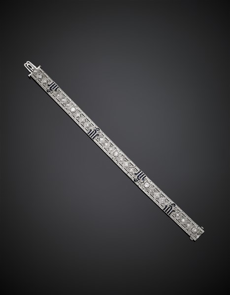 Bracciale modulare traforato in oro bianco e diamanti con zaffiri calibré a definire il decoro stilizzato, g 28,95, lungh. cm 17,60 circa. (difetti)