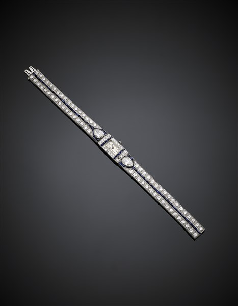 Orologio da polso da donna in platino con diamanti rotondi e zaffiri calibré in parte sintetici, ai lati del quadrante due diamanti a goccia di ct. 1,35 circa e di ct. 1,25 circa, per complessivi ct. 11,50 circa, g 41,81, lungh. cm 18,50, h cm 1,10 circa. (lievi difetti)