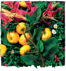 Piero Gilardi Torino 1942 Mandarini e vite vergine, (2001) Poliuretano espanso dipinto (in teca di plexiglass), cm. 31x31x15,5 (teca) Titolo e firma al verso su un cartiglio: "Mandarini e / vite vergine" / Gilardi Piero. Foto autenticata dall'artista.