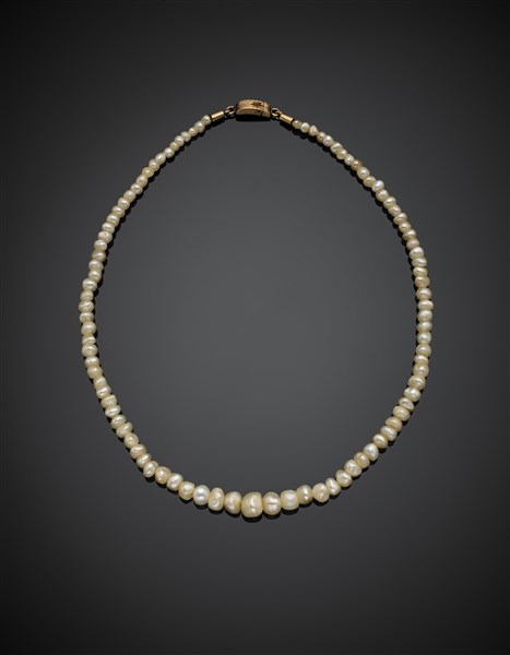 Natural saltwater pearl graduated necklace with red gold clasp, pearl diam. from mm 3 to mm 8.50 circa, g 20, length cm 42.50 circa.
