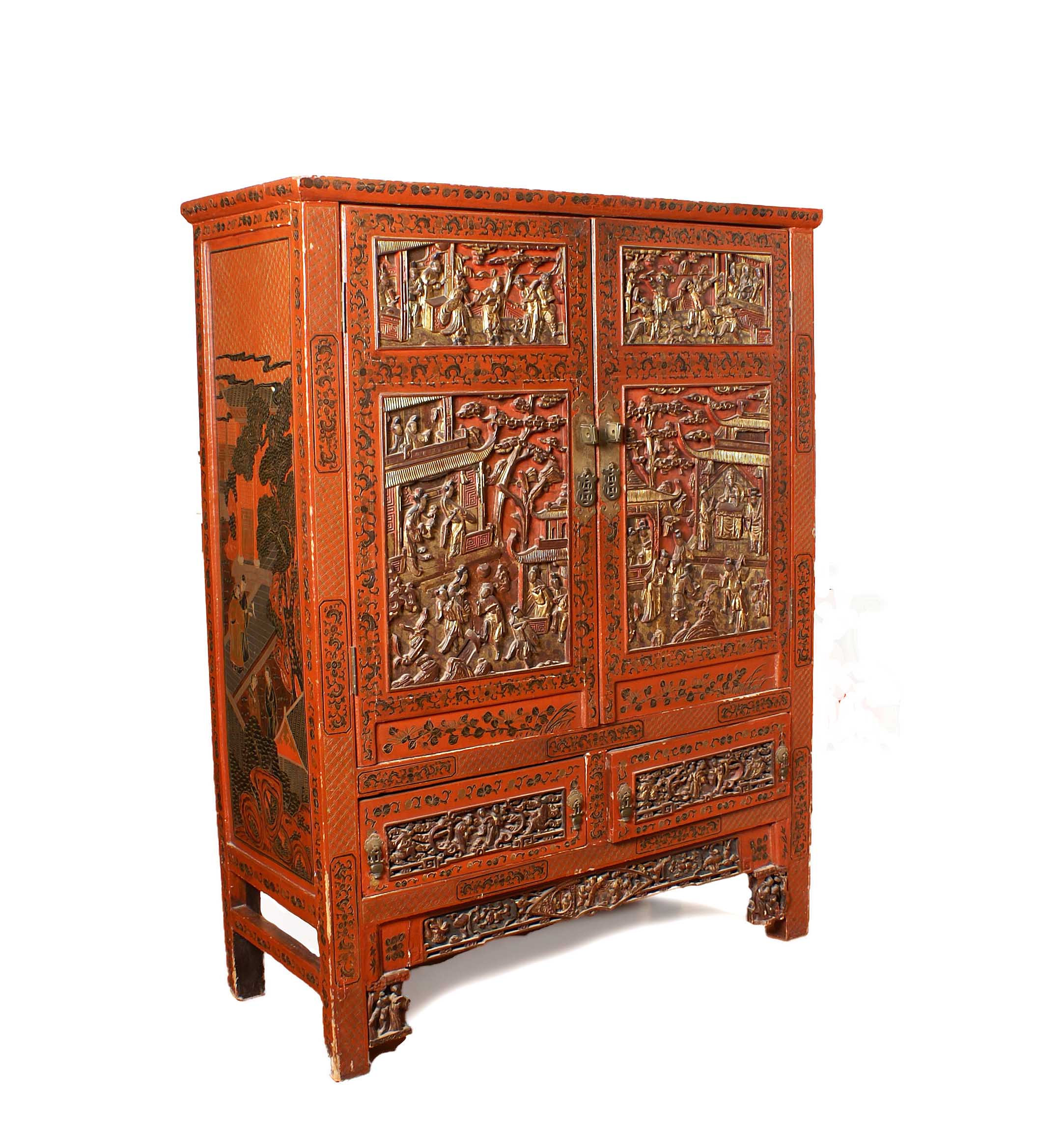 ARMADIO CINESE Inizi del XX Sec. In legno a lacca rossa e parzialmente dorato, fronte a due sportelli e due cassetti sottostanti con decorazioni in rilevo a raffigurare scene di vita orientale, fianchi laccati e dipinti in policromia a motivi di paesaggi con figure Dim. 153x118x48 cm.
