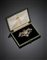Broche a volute floreali in oro giallo, smalti, diamanti e gemme varie, al centro una doppietta rosa, g 19,69, largh. cm 6,80 circa. Lettere e numeri iscritti sul retro. In scatola originale di WARTSKI