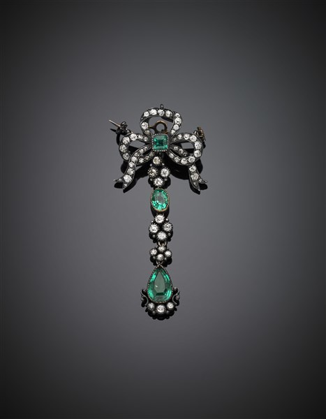 Spilla a fiocco con pendente smontabile in argento con diamanti e tre smeraldi,