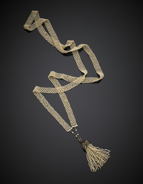 Seed pearl woven ribbon sautoir with tassel, white gold, silver and rose cut diamonds details, g 18.47, length cm 87.50 circa.