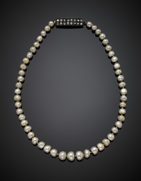 Collana a scalare in perle naturali d'acqua salata, g 22,13, lungh. cm 37 circa.