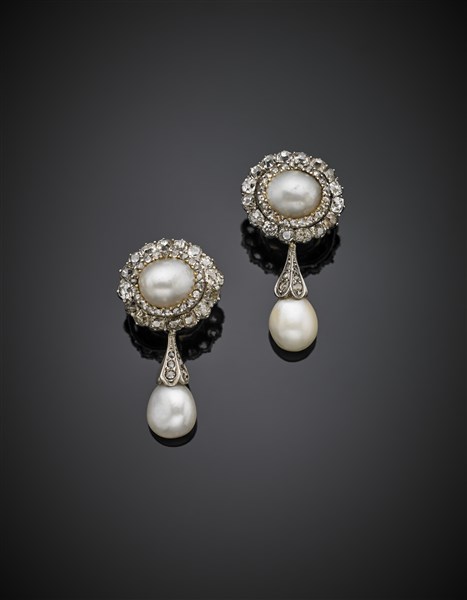 Orecchini pendenti in oro giallo, argento, diamanti e perle ovali a bottone a sostenere due perle a goccia naturali d'acqua salata, il pendente removibile, diamanti per complessivi ct. 2,00 circa, g 12,95, lungh. cm 3,50 circa.