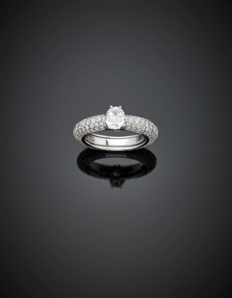 Oval ct. 0.72 circa diamond and diamond pavé white gold ring, in all ct. 3.29 circa, size 17/57 with inside ring, g 8.23. Marked 2297 MI. With original guarantee