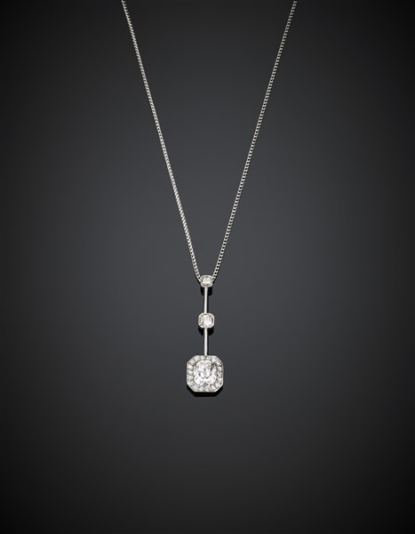 White gold diamond pendant with central cushion diamond ct. 1.60 circa and white gold chain, pendant cm 3.30, g 6.48, length cm 47.50 circa.