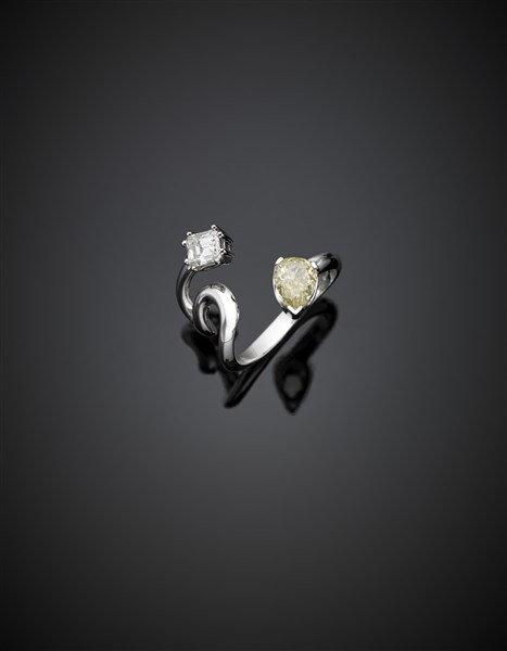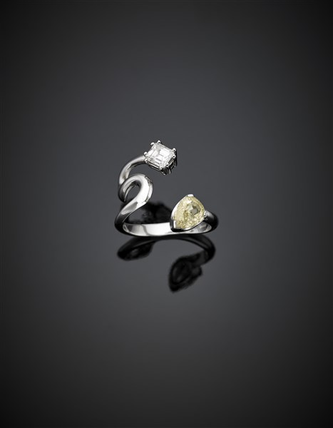 Pear ct. 0.85 circa and step cut ct. 0.60 circa diamond white gold snake ring, g 5.69 size 16/56. Marked 2297 MI.