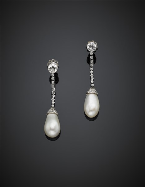 Orecchini pendenti in oro bianco, platino e diamanti per complessivi ct. 1,50 circa di cui i due più grandi da 0.60 ct circa l'uno terminati da due perle naturali d'acqua salata a goccia, g 9,42, lungh. cm 4,50 circa.