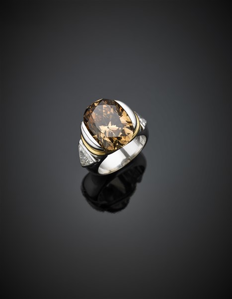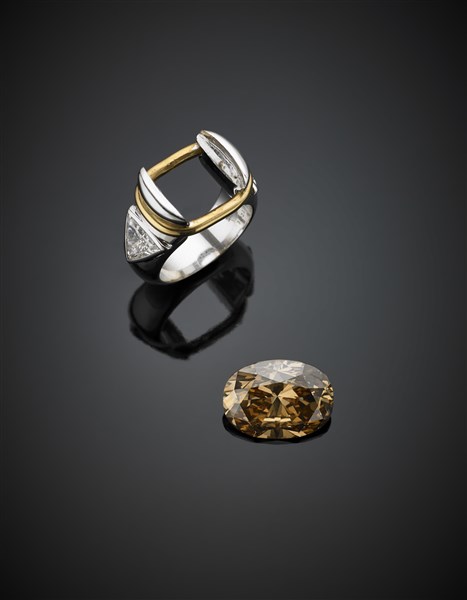 Anello in oro bianco e giallo con due diamanti triangolari taglio a brillante modificato per complessivi ct. 1,60 circa ai lati di un diamante ovale fancy brown yellow di ct. 10,36 g 17,74 misura 12/52. Firmato e marcato Pederzani, 1311 MI, 10.36. In scatola originale Pederzani