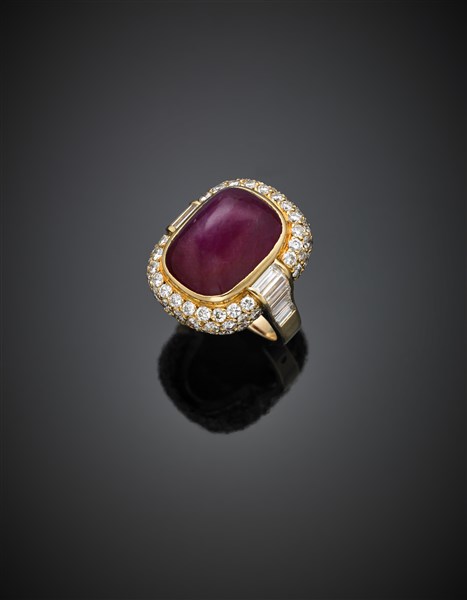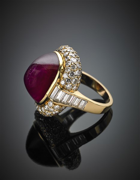 Lotto 362 | CARTIER Anello in oro giallo con rubino sugar loaf di ct. 25 circa e diamanti p