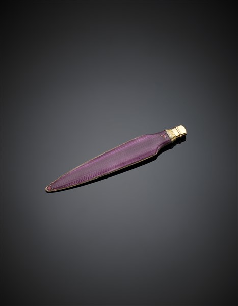 Yellow chased gold and light purple guilloché enamel scent bottle, g 26.50, length cm 11.90 circa. Originally cased by CARTIER