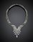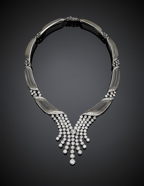 Collier in oro bianco a segmenti di cristallo di rocca interrotti da diamanti e finiti al centro con frangia di diamanti a scalare, per complessivi ct. 13,50 circa, g 99,16, lungh. cm 40 circa. Marcato 26 AL.