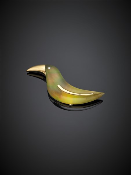 Spilla a guisa di tucano in oro giallo e pietra di luna su base iridescente, rifinita con piccolo diamante, g 22,15, lungh. cm 5,60 circa. Firmato e marcato Vhernier, 3229 AL, 24 D.