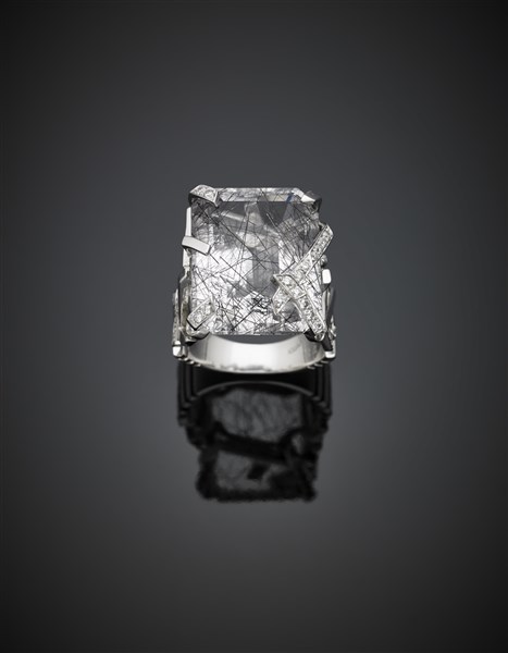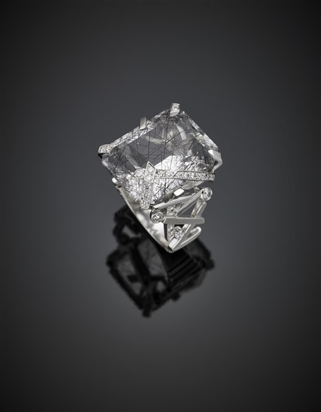 Anello in oro bianco e diamanti per complessivi ct. 0,60 circa rifinito con quarzo rutilato centrale di ct. 27,30 circa g 18,89 misura 21/61. Marchio francese, firmato Chanel, 56. In scatola originale "Chanel Paris"