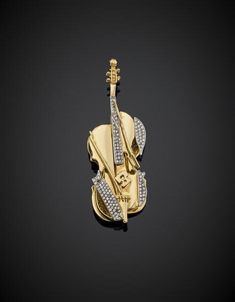 Broche in oro giallo a guisa di violino scomposto rifinita con diamanti per complessivi ct. 1,00 circa, g 28,59. Firmato Arman 3/8, 169 VR. (mancanze)