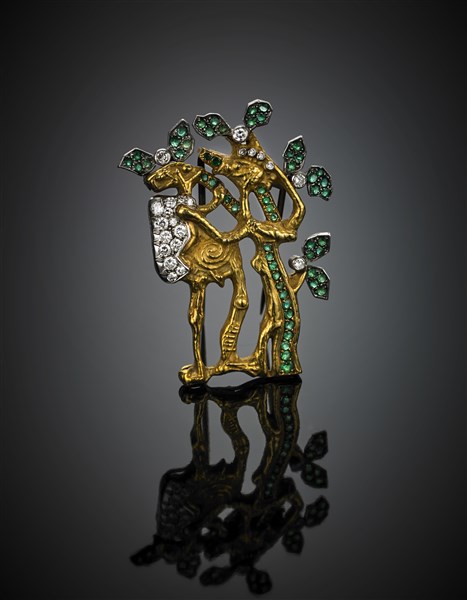 Round diamond in all ct. 0.70 circa and emerald in all ct. 1.70 circa anthropomorphic bi-coloured gold brooch, g 20.13, length cm 5.50 circa. Signed Afro, Masenza Roma. (defects)