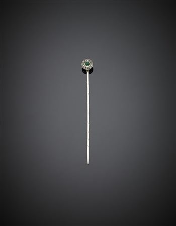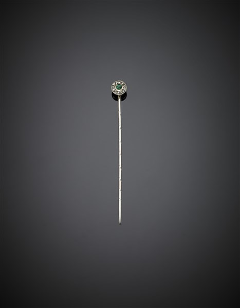 Rose cut diamond and emerald white gold tie-pin, g 1.06, length cm 5.80 circa. In a Verdoni Gioielliere Parma case