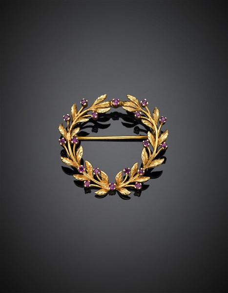 Yellow gold and ruby laurel wreath brooch, g 6.72, width cm 3.50 circa. In case by L.W. Cassina Gioielliere Milano