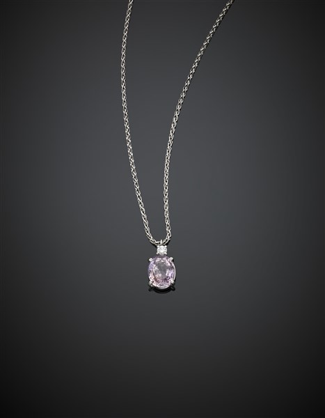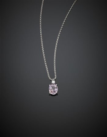 White gold chain with ct. 3.70 circa pink oval corundum and diamond pendant, g 5.60, length cm 42.30 circa. Marked 737 AR.