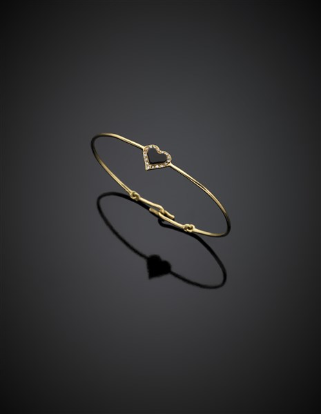 Bracciale rigido in oro giallo con centrale a cuore in onice e diamanti, g 5,19, diam. cm 5,80.