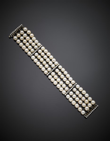 Bracciale a quattro fili di perle con chiusura e distanziatori in oro bianco e diamanti per complessivi ct. 0,70 circa, g 49,29, lungh. cm 17,70 circa.
