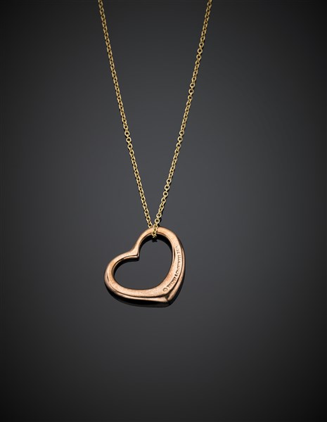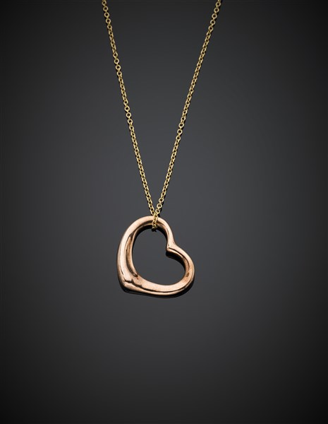 Pendente a cuore in oro rosa con catenina in oro giallo, g 4,92, lungh. cm 46,50 circa. Il cuore firmato Tiffany & Co, Peretti.