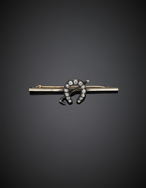 Spilla a barretta in oro giallo 333/1000, argento e diamanti con ferro di caval