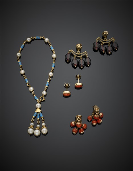 Yellow gold lot comprising a bracelet and three pairs of earrings with red orange coral, garnets, pearls and blue enamel, in all g 42.07. (defects)