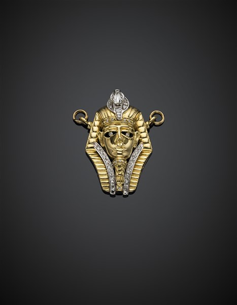 Lotto 514 | Centrale in oro giallo, bianco e diamanti a guisa di maschera da faraone, g 14,