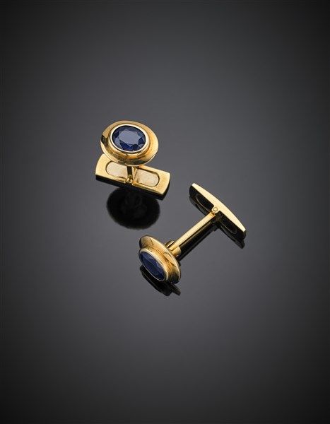 Oval sapphire yellow gold cufflinks, g 10.28, width cm 1.40 circa. Marked 692 FI.