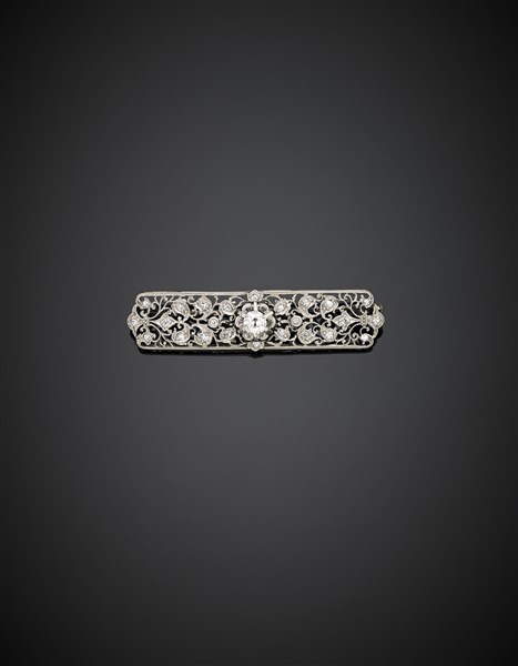 Broche traforata in platino e diamanti rotondi, il diamante centrale rotondo taglio vecchio europeo di ct. 0,30 circa, g 6,62, lungh. cm 5 circa. Marcata 108 MI, PT.