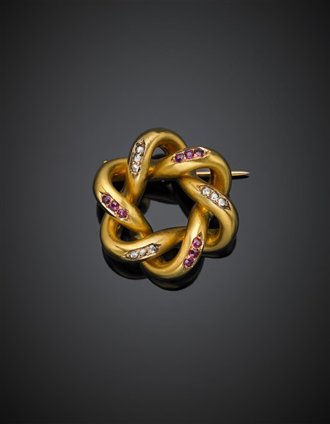 Lotto 527 | Spilla in oro giallo rifinita con rubini e diamanti, g 12,92, diam. cm 3. (dife